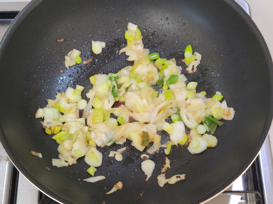 2. 대파 1대를 송송 썰어 팬에 넣고, 파가 약간 탈 때까지 볶아 파기름을 만든다.