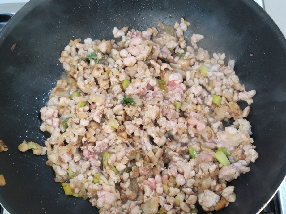 3. 파기름이 완성되면 간 돼지고기를 팬에 넣고 센불로 함께 볶는다.