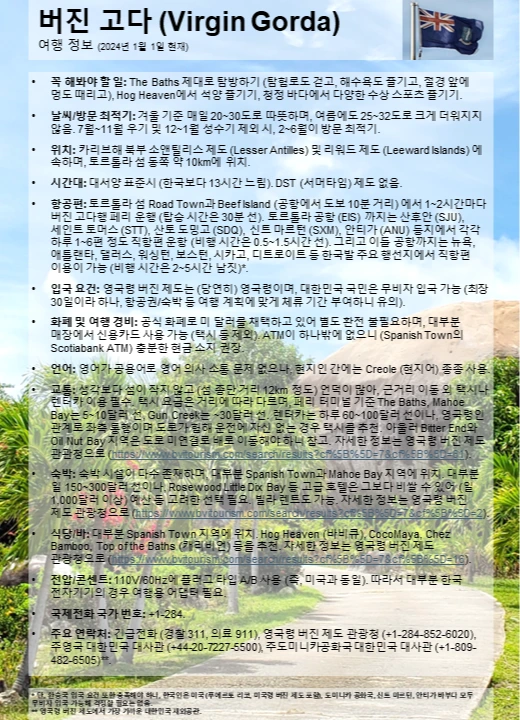 입국 요건: 영국령 버진 제도는 (당연히) 영국령이며, 대한민국 국민은 무비자 입국 가능 (최장 30일이라 하나, 항공권/숙박 등 여행 계획에 맞게 체류 기간 부여하니 유의).