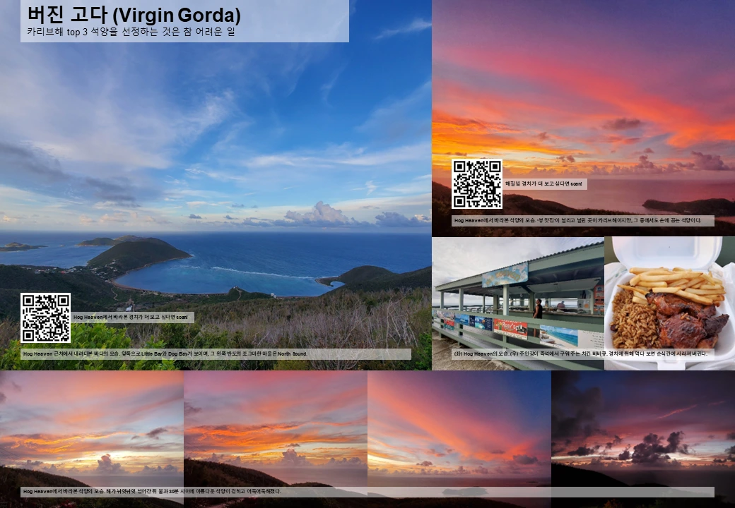 별로 크지도 않은 섬이기에 20분 정도만 달리면 섬 북쪽에 도달할 수 있고 (Bitter End나 Oil Nut Bay도 버진 고다 섬의 일부이지만, 도로가 연결되어 있지 않아 이 쪽에 가보려면 배를 타야 한다), 이 외딴 산등성이에 Hog Heaven이라는 식당/바가 하나 있다. 그런데 지나면서 언뜻 보이는 전망이 장난이 아니다. 왠지 오늘 저녁은 여기여야만 할 것 같았다.