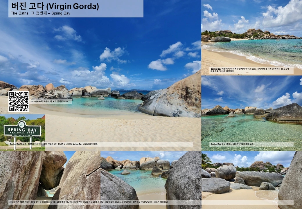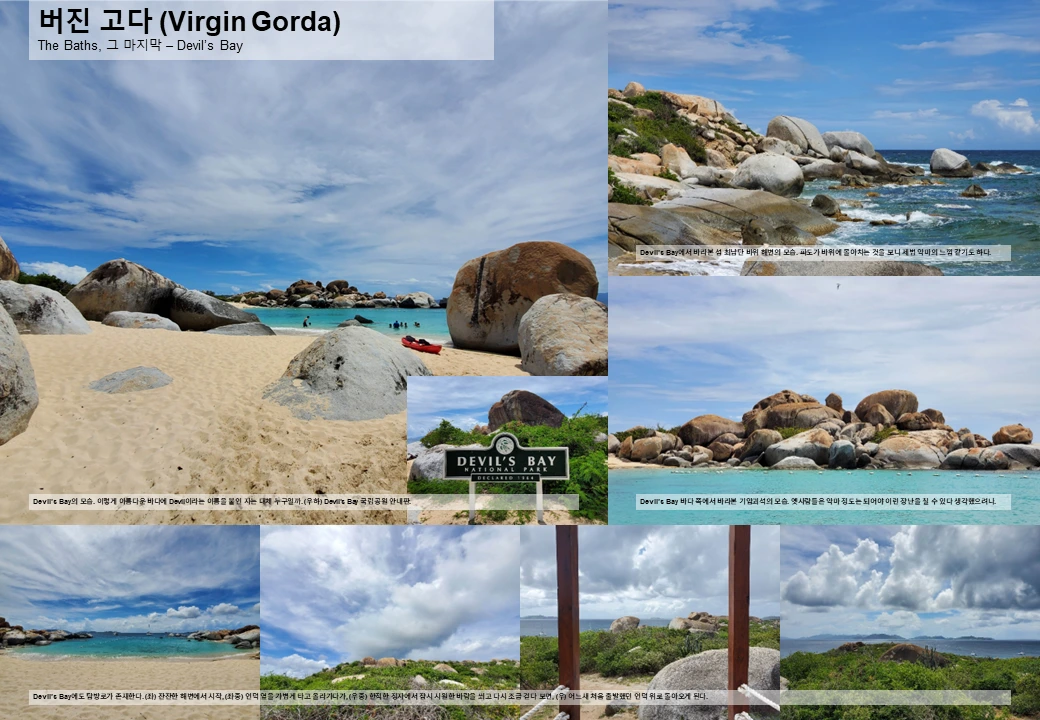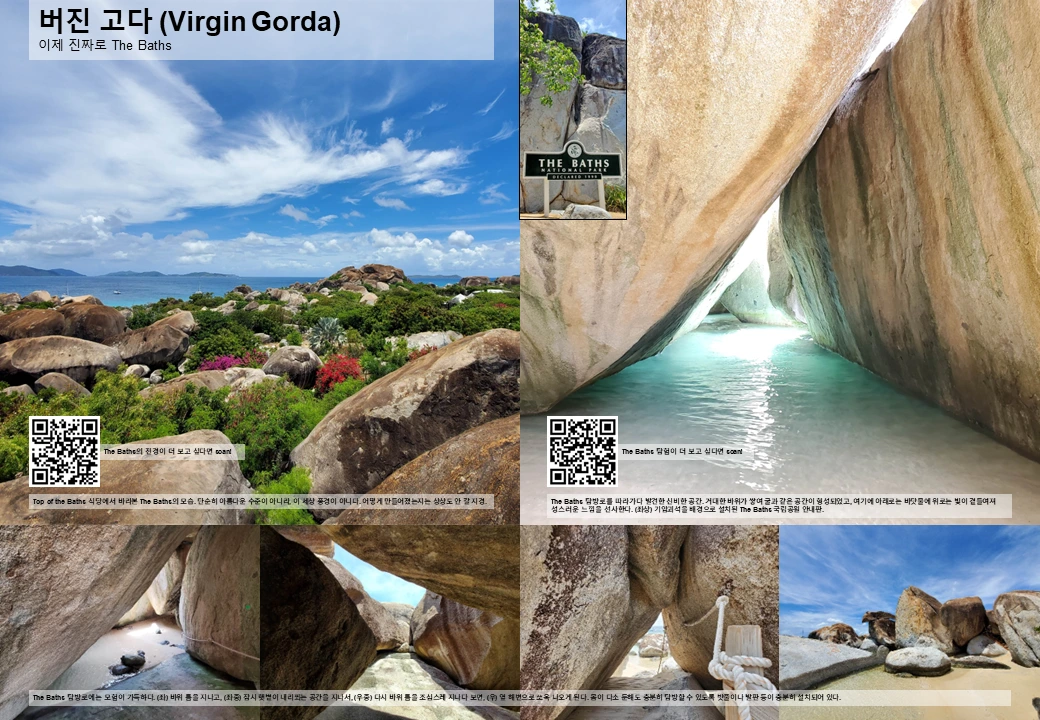 버진 고다 섬 남쪽에는 자연이 놀다 간 흔적이 널려 있다. ‘The Baths’라 불리는 지역이 바로 그것인데, 거인들이 거대한 화강암 바위로 구슬치기라도 했던 것처럼 거대한 화강암 바위가 이곳 저곳에 막 널려 있다. 그래서 길을 가다가도 갑자기 이곳 저곳에 놓여 있는 거대한 기암 괴석이 눈에 들어오고, 해변에도 각종 기암 괴석이 이곳 저곳에 자연 수영장을 만들어 두었다.