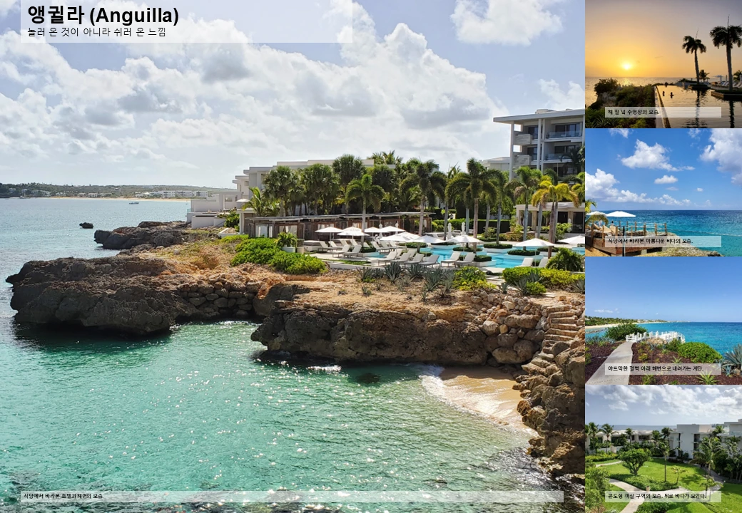 숙박: 호텔 및 빌라 렌트 등 옵션 다양하나 가격대 또한 다양하므로 예산 고려한 선택 필요. 저렴한 호텔은 일 150~300달러 선이나, Four Seasons, Belmond 등 럭셔리 리조트는 일 700달러 이상. 자세한 정보는 앵귈라 관광청으로 (https://ivisitanguilla.com/where-to-stay).