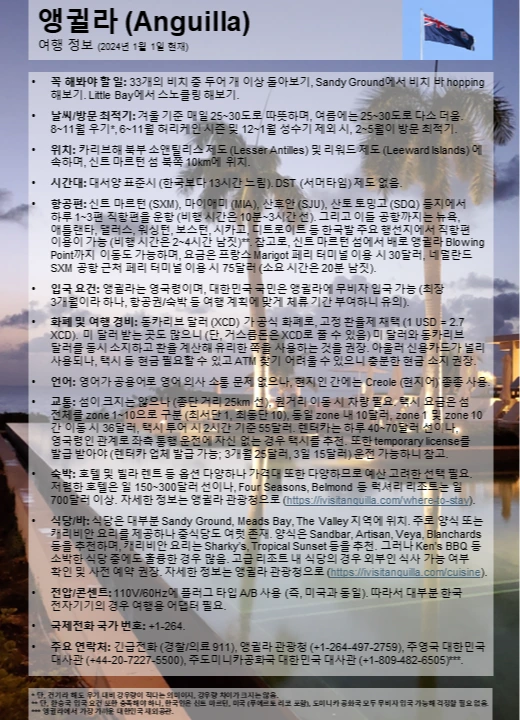주요 연락처: 긴급전화 (경찰/의료 911), 앵귈라 관광청 (+1-264-497-2759), 주영국 대한민국 대사관 (+44-20-7227-5500), 주도미니카공화국 대한민국 대사관 (+1-809-482-6505)***.