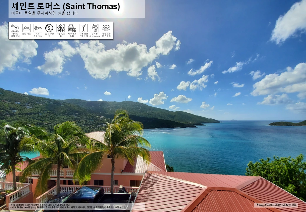 꼭 해봐야 할 일: Brewers Bay나 Magens Bay에서 해수욕 즐기기, Drake’s Seat에서 Charlotte Amalie 전망 즐기기, Charlotte Amalie 거리 탐방하기, 바다거북과 스노클링 해보기.