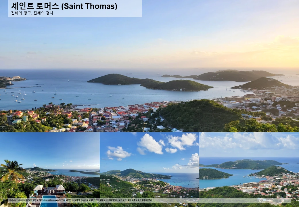 항공편: 뉴욕, 애틀랜타, 워싱턴, 시카고 등 한국발 주요 행선지에서 세인트 토머스 공항 (STT) 까지 직항편 이용 가능 (비행 시간은 미국 본토 내 출발지 따라 상이하며, 통상 3.5~5시간 선).