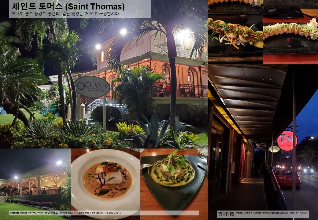 식당/바: 대부분의 식당은 Charlotte Amalie 지역에 위치하며, 다양한 식당이 존재하여 즐거운 식도락 생활 가능. Oceana (캐리비언), French Quarter Bistro (프렌치), Stone House Café (아메리칸), Amalie Café (해산물), Prime at Paradise Point (스테이크), Blue 11 (파인 다이닝) 등을 추천. 자세한 정보는 미국령 버진 제도 관광청으로 (https://www.visitusvi.com/food-drink).