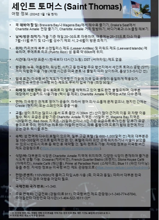 주요 연락처: 긴급전화 (경찰/의료 911), 미국령 버진 제도 관광청 (+1-340-774-8784), 주애틀랜타 대한민국 대사관 (+1-404-522-1611~3)**.