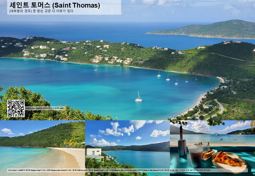Magens Bay가 그랬다. 해적 소굴로 쓰이면 딱일 것 같은 깊은 만 안쪽에 (실제로 Sir Francis Drake가 여기를 근거지로 삼고 인근 항해선 중 약탈 대상을 물색했다는 이야기가 있다) 평화로운 비치가 형성되어 있고, 바다에는 요트가 둥둥 떠있는 그림 같은 풍경. 해변 매점에서 즐기는 맛있는 피자와 핫도그 (누가 미국령 아니랄까봐) 는 덤.