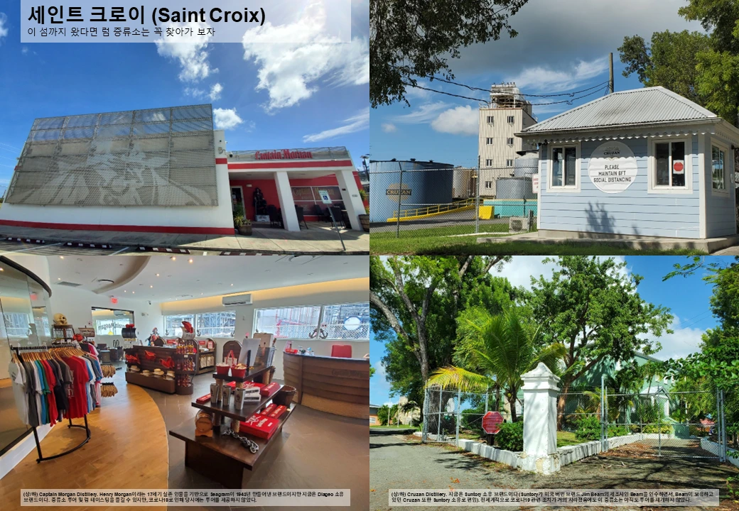 꼭 해봐야 할 일: Captain Morgan 및 Cruzan Distillery 방문해 럼 즐겨보기, Christiansted와 Frederiksted 거리 탐방하기, 주변 바다에서 다이빙과 스노클링 즐기기.