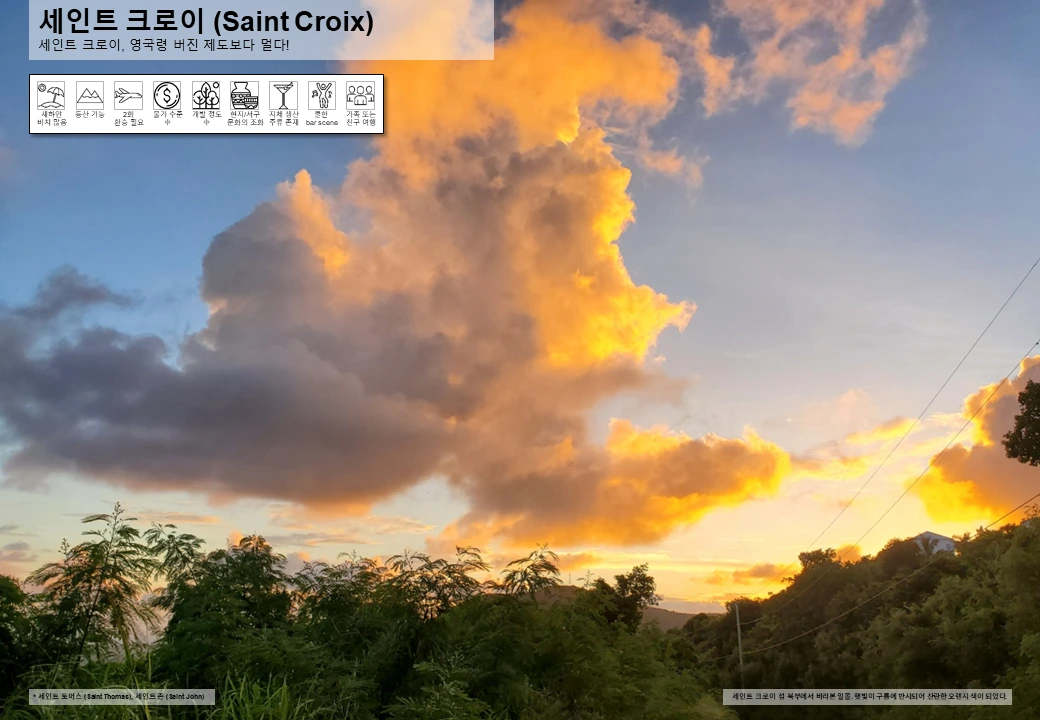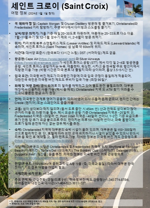 화폐 및 여행 경비: 공식 화폐로 미 달러를 채택하고 있어 별도 환전 불필요하며, 대부분 매장에서 신용카드 사용 가능 (택시 등 제외). Christiansted 지역 외 ATM 찾기 어려울 수 있으니 충분한 현금 소지 권장.