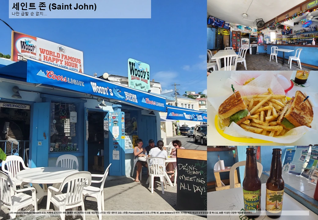 꼭 해봐야 할 일: Virgin Islands 국립공원에 푹 빠져 보기 (해수욕, 등산, 스노클링, 플랜테이션 유적 등), Windmill Bar에서 경치 구경하며 멍 때리기, Cruz Bay 분위기에 빠져 유유자적하기.