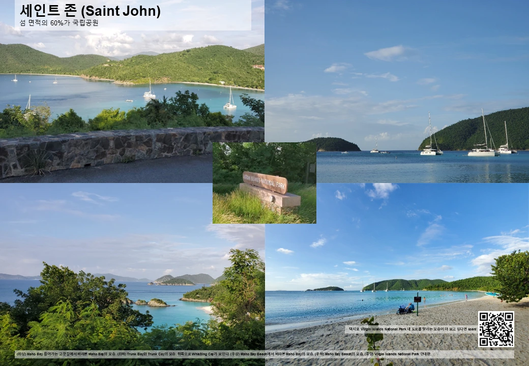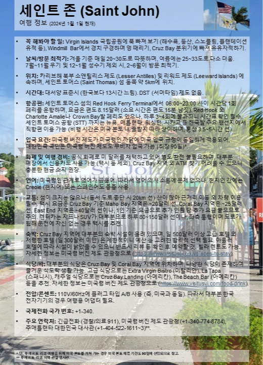 화폐 및 여행 경비: 공식 화폐로 미 달러를 채택하고 있어 별도 환전 불필요하며, 대부분 매장에서 신용카드 사용 가능 (택시 등 제외). Cruz Bay 지역 외 ATM 찾기 어려울 수 있으니 충분한 현금 소지 권장.