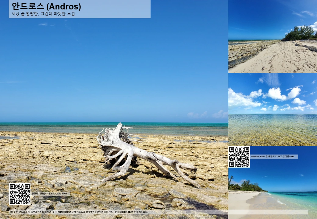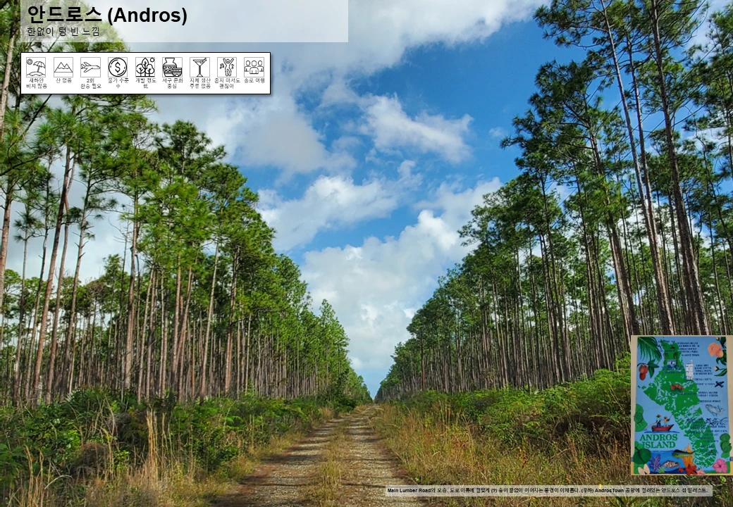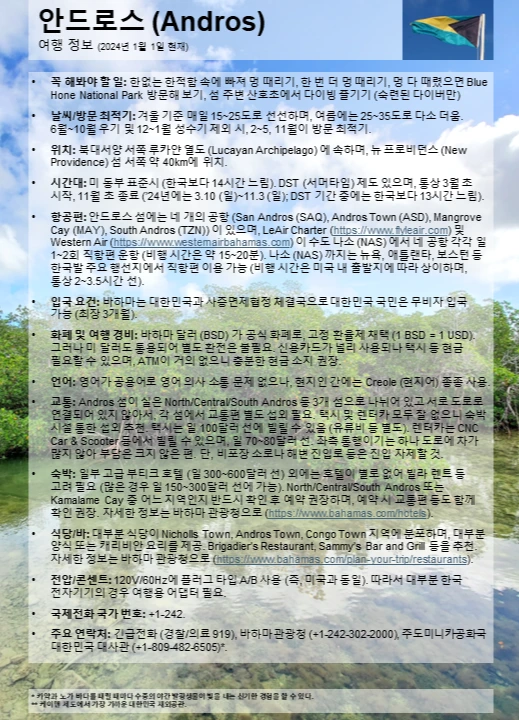 교통: Andros 섬이 실은 North/Central/South Andros 등 3개 섬으로 나뉘어 있고 서로 도로로 연결되어 있지 않아서, 각 섬에서 교통편 별도 섭외 필요. 택시 및 렌터카 모두 잘 없으니 숙박 시설 통한 섭외 추천. 택시는 일 100달러 선에 빌릴 수 있음 (유류비 등 별도). 렌터카는 CNC Car & Scooter 등에서 빌릴 수 있으며, 일 70~80달러 선. 좌측 통행이기는 하나 도로에 차가 많지 않아 부담은 크지 않은 편. 단, 비포장 소로나 해변 진입로 등은 진입 자제할 것.