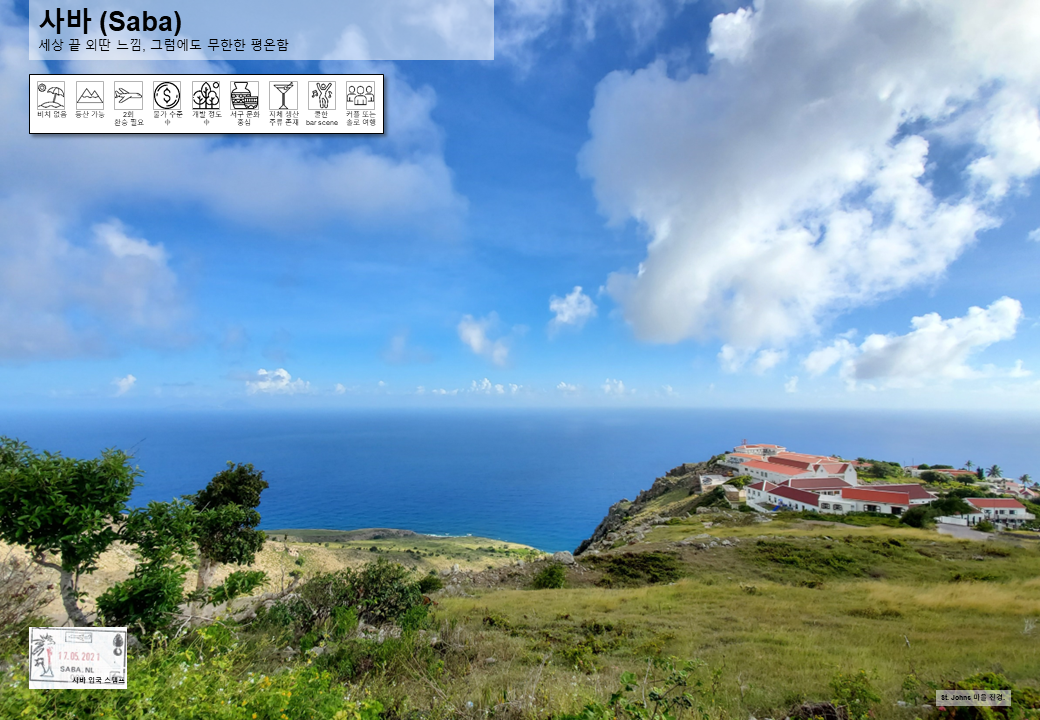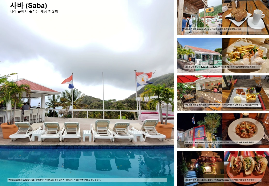 꼭 해봐야 할 일: 네덜란드 최고봉 등반해 보기, 청정 바다 다이빙 해보기 (숙련된 다이버만), Saba Spice Rum 마셔 보기, 그리고… 어디서든 멍 때리기.