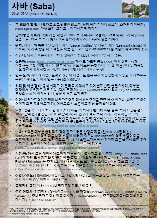 주요 연락처: 긴급전화 (경찰/의료 911), 사바 관광청 (+599-416-2231/2322), Winair (+1-721-545-4237), 주네덜란드 대한민국 대사관 (+31-70-740-0200), 주도미니카공화국 대한민국 대사관 (+1-809-482-6505)**.