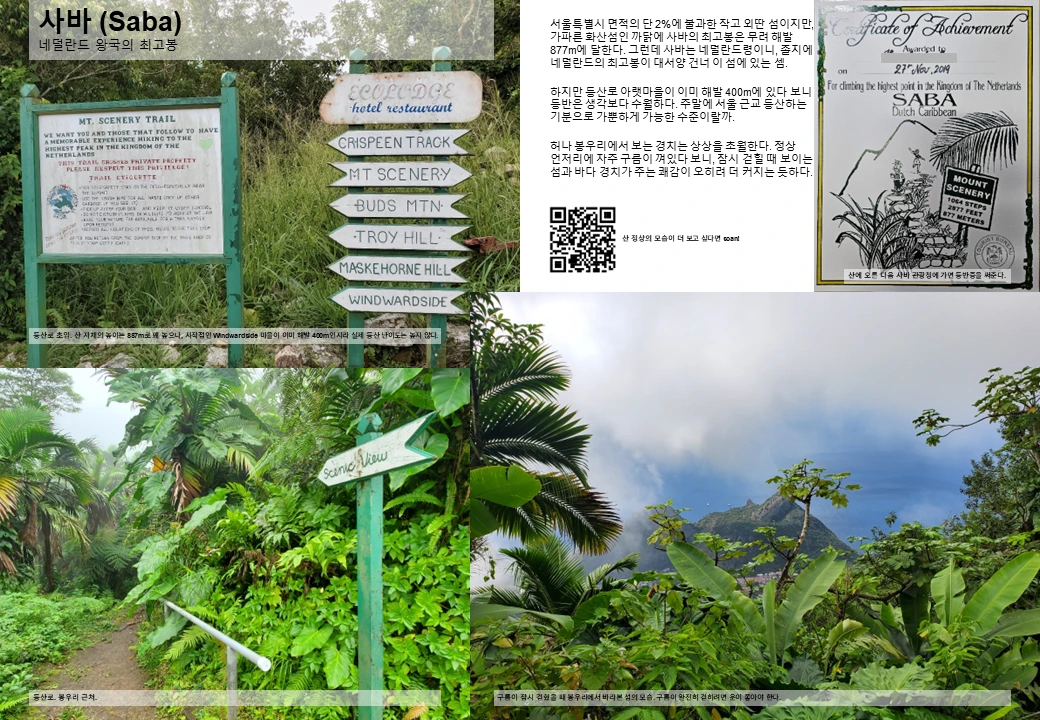 서울특별시 면적의 단 2%에 불과한 작고 외딴 섬이지만, 가파른 화산섬인 까닭에 사바의 최고봉은 무려 해발 877m에 달한다. 그런데 사바는 네덜란드령이니, 졸지에 네덜란드의 최고봉이 대서양 건너 이 섬에 있는 셈.