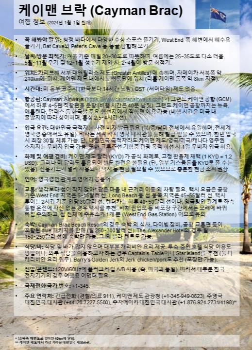 주요 연락처: 긴급전화 (경찰/의료 911), 케이맨 제도 관광청 (+1-345-949-0623), 주영국 대한민국 대사관 (+44-20-7227-5500), 주자메이카 대한민국 대사관 (+1-876-924-2731/4198)**.