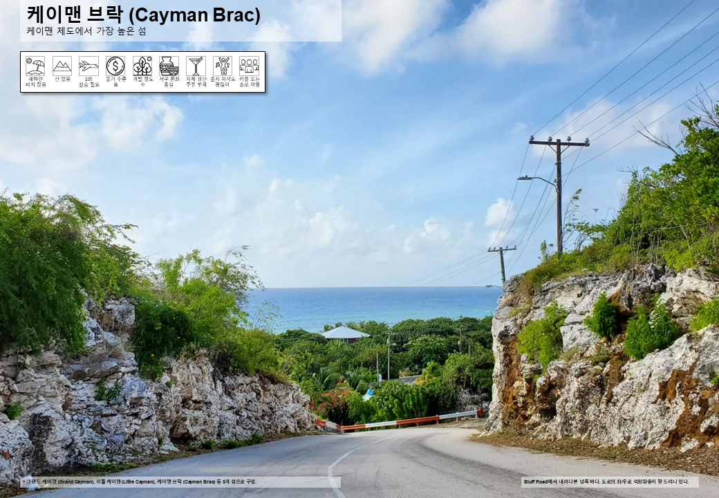 그래서 케이맨 브락 섬에는 케이맨 제도에서 가장 높은 지점이 존재한다 (The Bluff). 그래봐야 해발 43m이지만, 그래도 그 덕에 케이맨 브락 섬은 다른 두 섬과는 확연히 다른 매력을 보여준다.