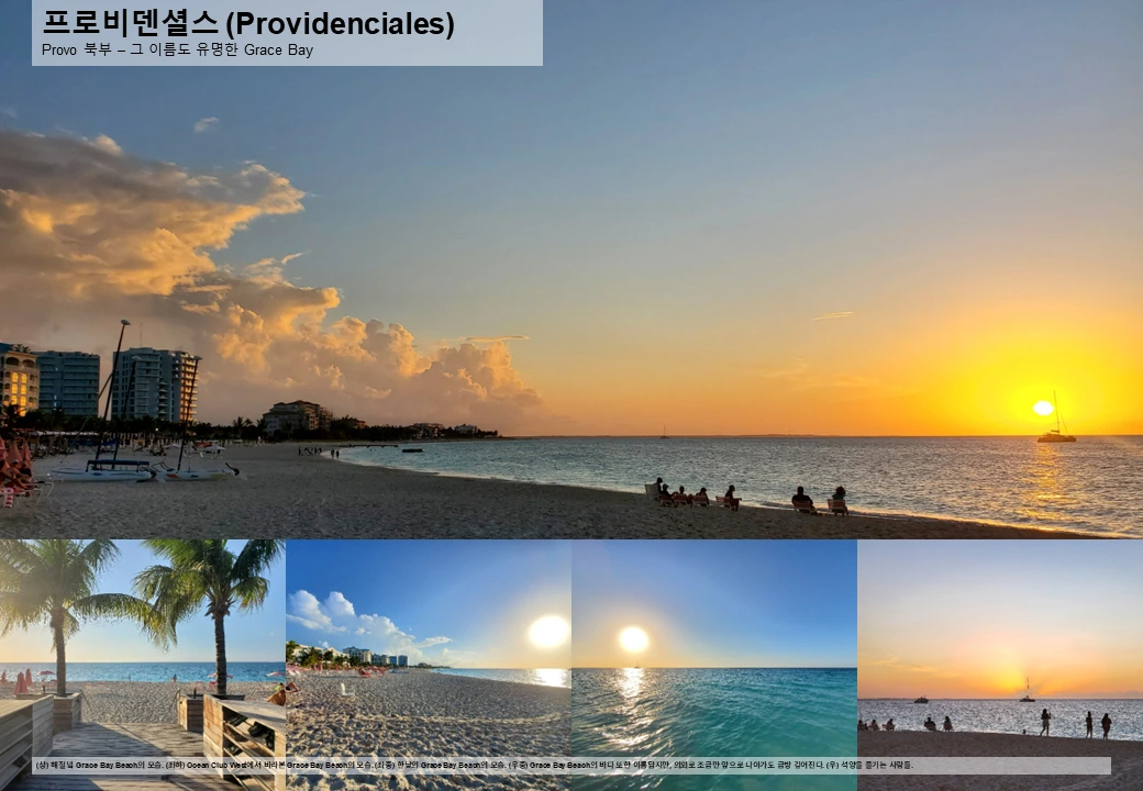 코로나19 팬데믹이 완전히 다 끝나지 않은 시점이었는데도 그렇게 많은 사람들의 발자국이 찍힌 해변은 이곳이 처음이었다. 호사가들이 한번씩 거론하는 세계 몇 대 해변에 종종 오르내리는 Grace Bay가 바로 프로비덴셜스 북부 해안에 위치해 있다. 광활한 모래사장과 영롱한 바다 빛깔이 아름다운 조화를 이루며, 뒤로는 럭셔리 호텔들이 즐비하다.