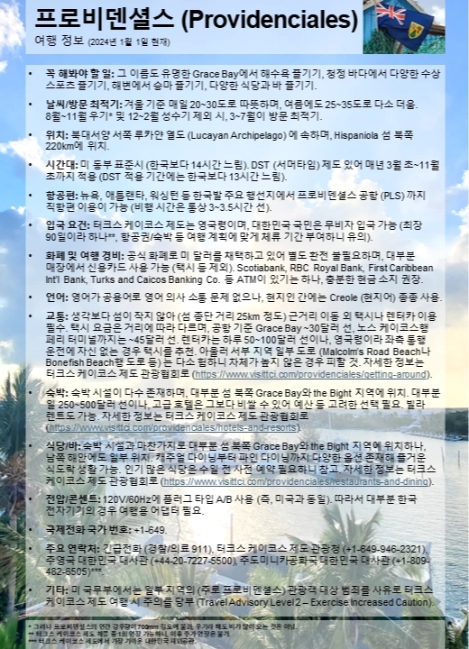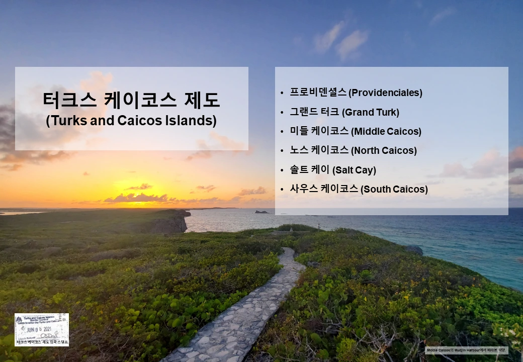 입국 요건: 터크스 케이코스 제도는 영국령이며, 대한민국 국민은 무비자 입국 가능 (최장 90일이라 하나**, 항공권/숙박 등 여행 계획에 맞게 체류 기간 부여하니 유의).