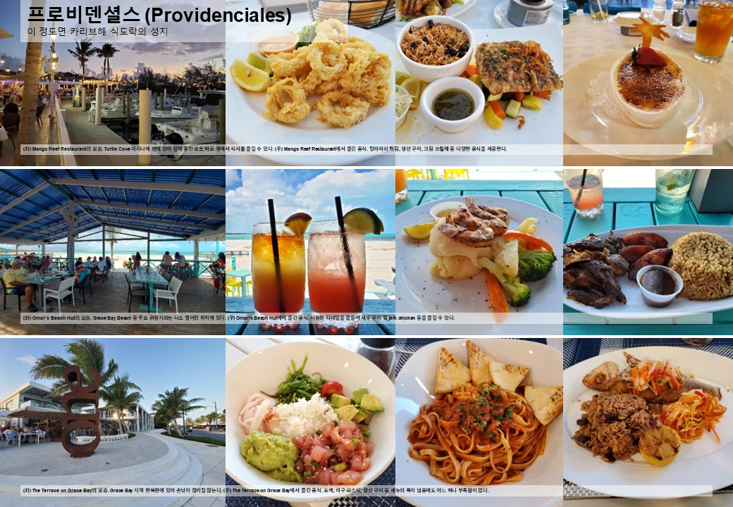 식당/바: 숙박 시설과 마찬가지로 대부분 섬 북쪽 Grace Bay와 the Bight 지역에 위치하나, 남쪽 해안에도 일부 위치. 캐주얼 다이닝부터 파인 다이닝까지 다양한 옵션 존재해 즐거운 식도락 생활 가능. 인기 많은 식당은 수일 전 사전 예약 필요하니 참고. 자세한 정보는 터크스 케이코스 제도 관광협회로 (https://www.visittci.com/providenciales/restaurants-and-dining).