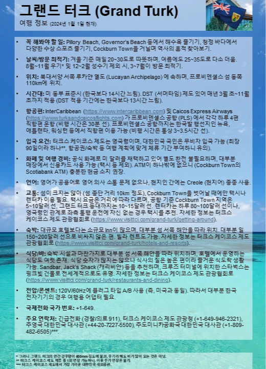 입국 요건: 터크스 케이코스 제도는 영국령이며, 대한민국 국민은 무비자 입국 가능 (최장 90일이라 하나**, 항공권/숙박 등 여행 계획에 맞게 체류 기간 부여하니 유의).