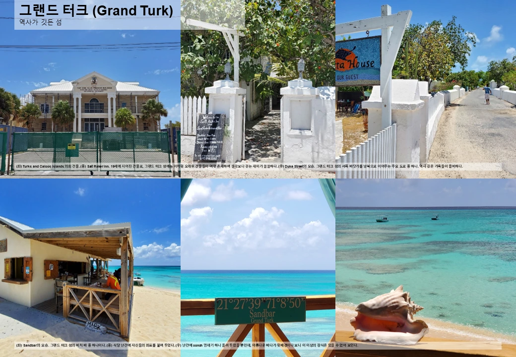 숙박: 대규모 호텔보다는 소규모 Inn이 많으며, 대부분 섬 서쪽 해안을 따라 위치. 대부분 일 150~200달러 선으로 비싸지 않은 편. 빌라 렌트도 가능. 자세한 정보는 터크스 케이코스 제도 관광협회로 (https://www.visittci.com/grand-turk/hotels-and-resorts).