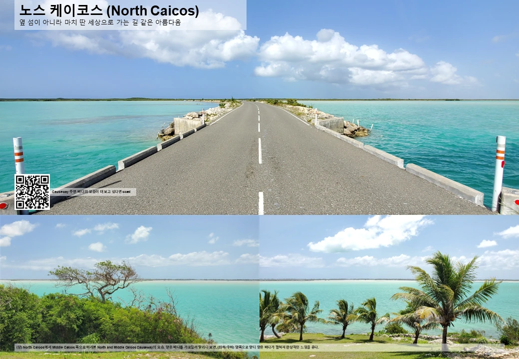 노스 케이코스의 동쪽 끝에는 미들 케이코스 (Middle Caicos) 로 연결되는 둑길이 존재한다. 2007년 이 길이 조성되기 전에는 노스 케이코스에서 미들 케이코스로 이동할 때 배를 이용해야만 했는데, 교통 환경이 대폭 개선된 셈. 이후 허리케인으로 파손되었다가 2014년 대대적인 보수를 거쳐 현재 상태를 유지하고 있다. 도로 선형도 좋고 포장 상태도 좋아 누구나 운전하기 편하고, 특히 좌우로 아름답기 그지 없는 바다가 펼쳐져 마치 바다 위를 운전하는 것 같은 느낌까지 든다.