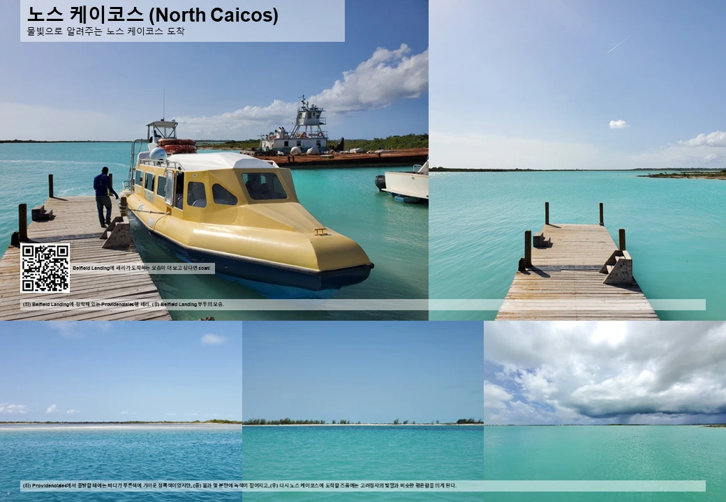 프로비덴셜스 동쪽 끝 페리 선착장에서 노스 케이코스로 가는 고속 페리를 탄다 (거리가 20km는 족히 될 텐데 이를 단 25분에 주파하니 고속 맞다). 그런데 이 25분 사이에 바다의 빛깔이 푸른색에서 밝은 청록색으로 변하는 것을 보는 재미가 쏠쏠하다. 물론 바닷물 자체가 달라져서가 아니고 바다가 점차 얕아지면서 그렇게 보이는 것이겠지만, 그래도 뭔가 이동 진척도를 색깔로 알려주는 것 같아 재미있다.