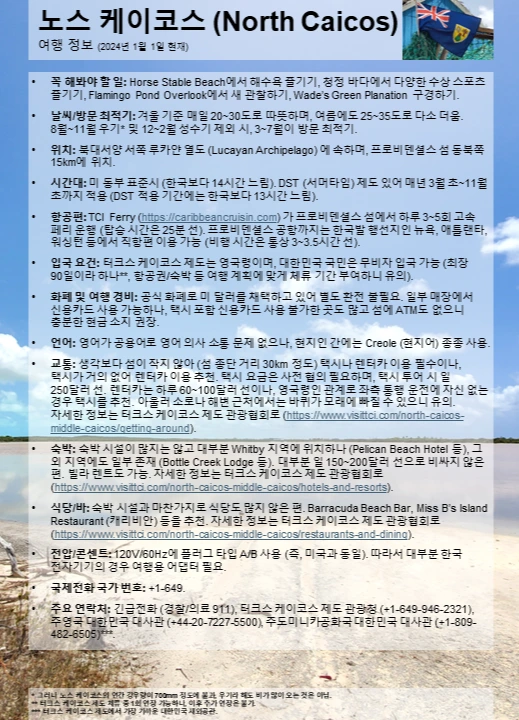 입국 요건: 터크스 케이코스 제도는 영국령이며, 대한민국 국민은 무비자 입국 가능 (최장 90일이라 하나**, 항공권/숙박 등 여행 계획에 맞게 체류 기간 부여하니 유의).