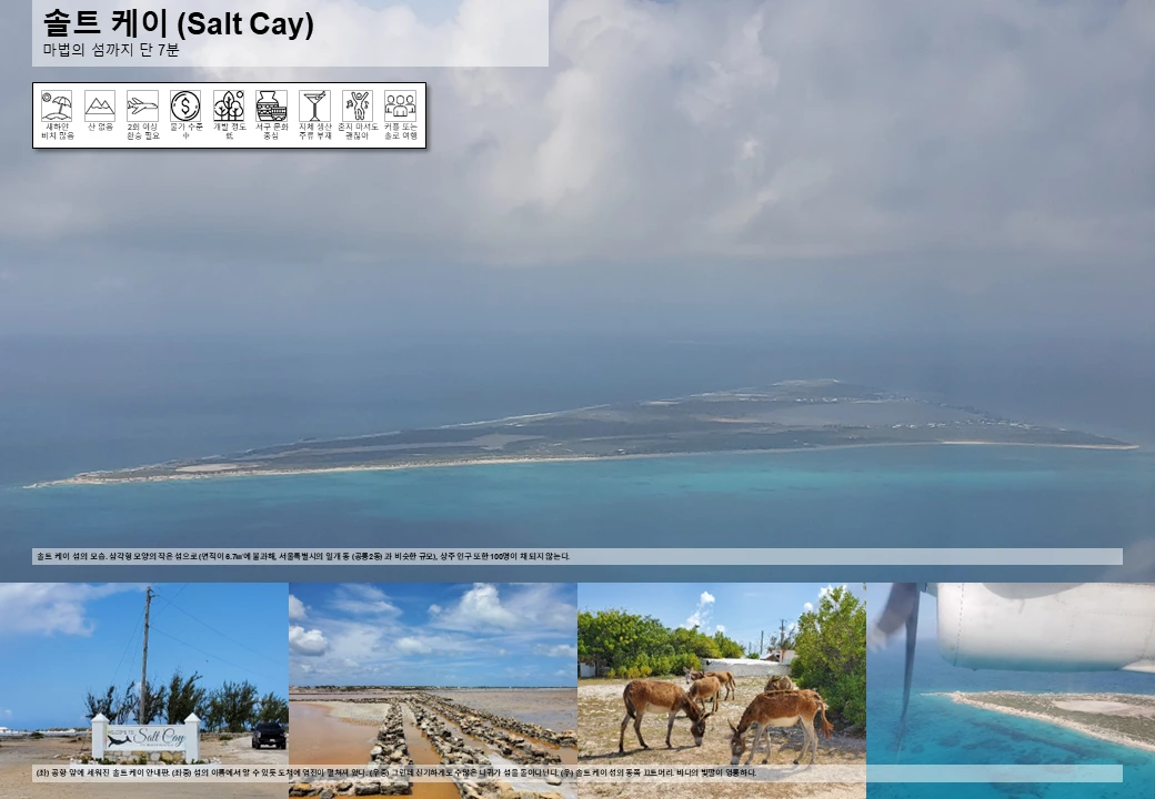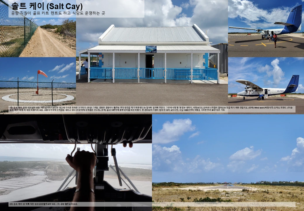 그랜드 터크 섬에서 솔트 케이행 경비행기에 탑승한다. 승객은 총 8명. 이윽고 힘차게 활주로를 박차고 이륙한 비행기가 크게 오른쪽으로 돌더니 이내 상승을 멈춘다. 기체에 문제라도 생긴 것일까 우려 섞인 걱정이 들 때쯤 그 이유를 알게 된다. 비행기 왼쪽 창문을 통해 솔트 케이 섬이 바로 눈앞에 보이기 때문. 이리도 가까우니 이륙 이후 굳이 많이 상승할 필요도 없었을 터. 나중에 솔트 케이 섬에 내린 후 시계를 보니 소요 시간은 단 7분. 세계에서 가장 짧은 항공 노선까지는 아니더라도, 분명 순위권에는 들 법하다.