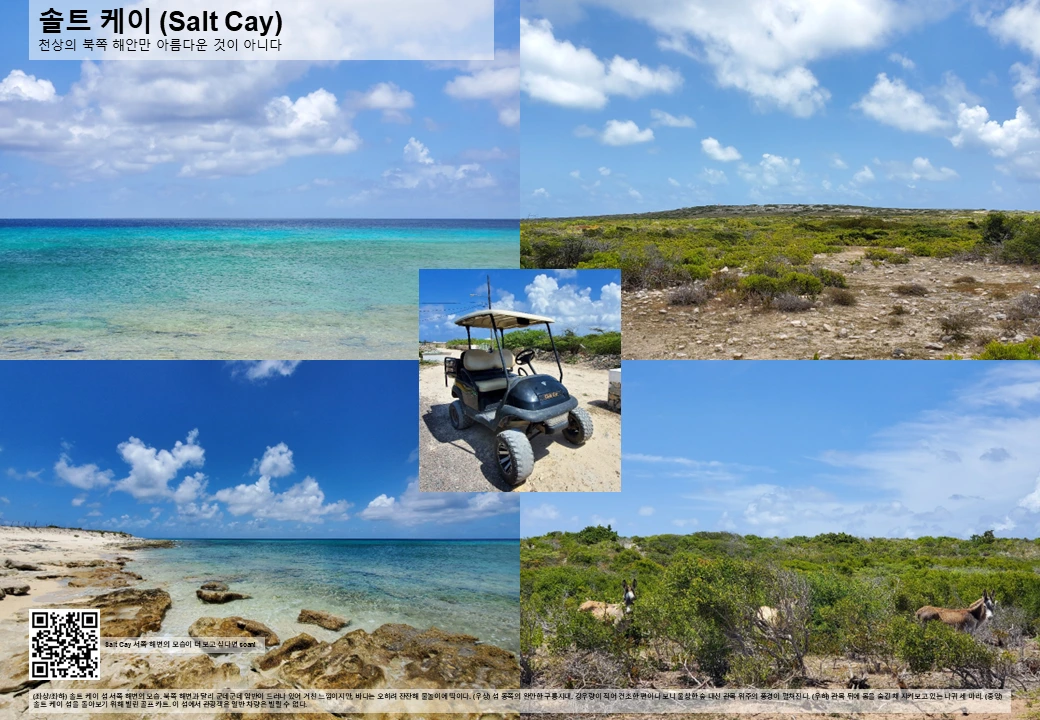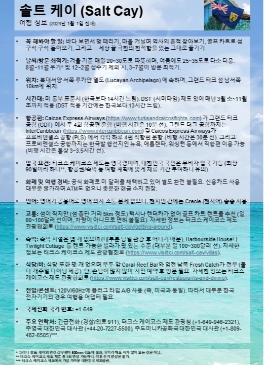 교통: 섬이 작지만 (섬 종단 거리 5km 정도) 택시나 렌터카가 없어 골프 카트 렌트를 추천 (일 80~100달러 선이며, 차량이 아니므로 면허 불필요). 자세한 정보는 터크스 케이코스 제도 관광협회로 (https://www.visittci.com/salt-cay/getting-around).