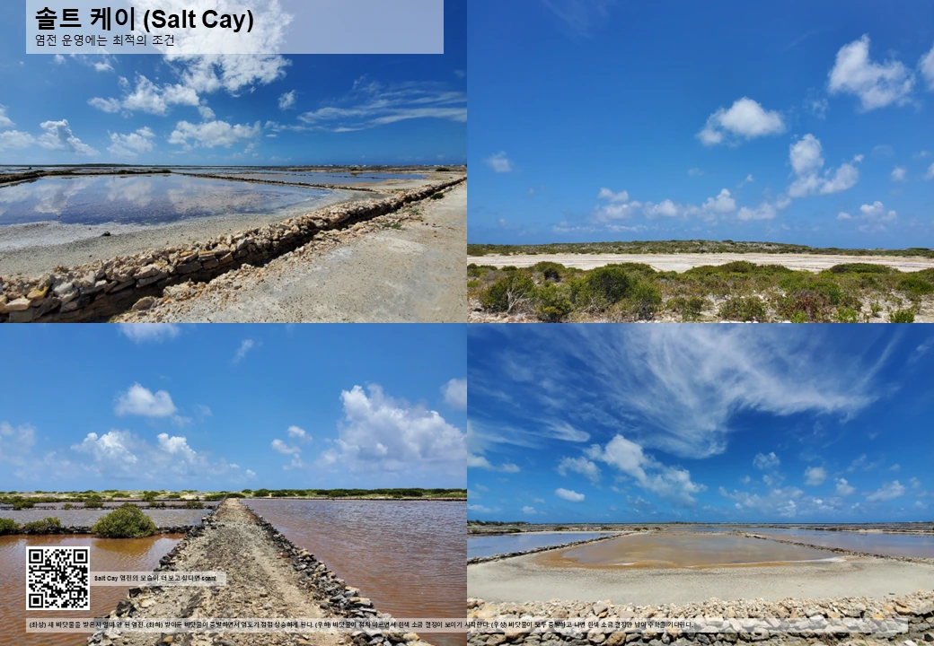 섬 전체가 평평할 뿐만 아니라 연중 온화하고 (물론 여름엔 덥고), 연간 강우량이 700mm 정도로 건조하기 때문에, 솔트 케이는 염정에 최적화된 섬이라 할 수 있을 터. 실제로 17세기 말 (영국의 식민지였던) 버뮤다 사람들이 이 섬에 정착했을 때에도 주 목적은 염전 운영이었다.