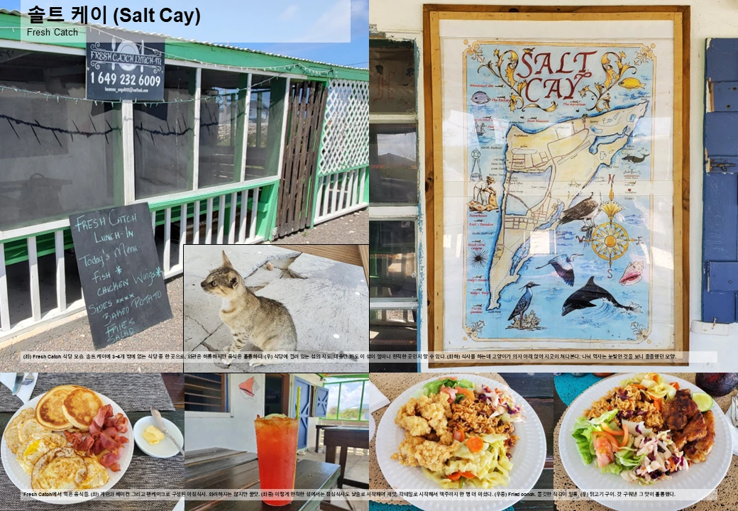 식당/바: 식당 또한 몇 개 없으며 부두 앞 Coral Reef Bar와 염전 남쪽 Fresh Catch가 전부 (둘 다 캐주얼 다이닝 제공). 단, 손님이 많지 않아 사전 예약 후 방문 필요. 자세한 정보는 터크스 케이코스 제도 관광협회로 (https://www.visittci.com/salt-cay/restaurants-and-dining).