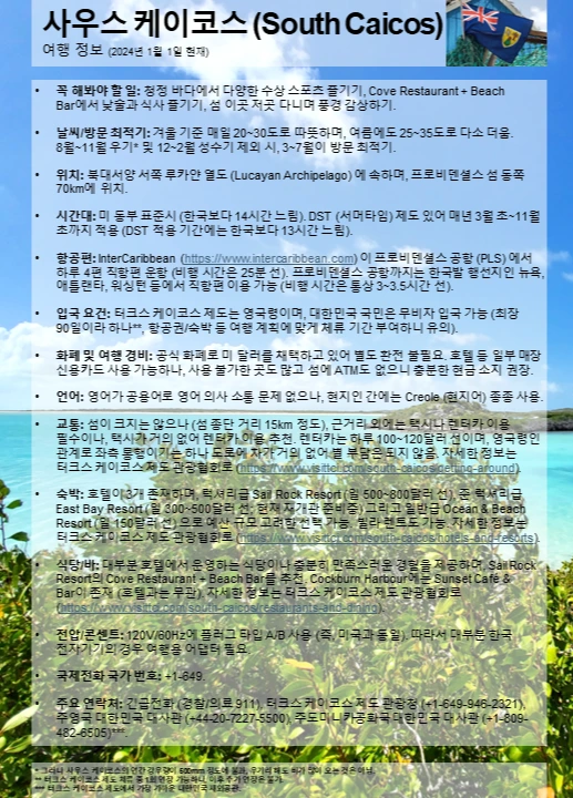 입국 요건: 터크스 케이코스 제도는 영국령이며, 대한민국 국민은 무비자 입국 가능 (최장 90일이라 하나**, 항공권/숙박 등 여행 계획에 맞게 체류 기간 부여하니 유의).