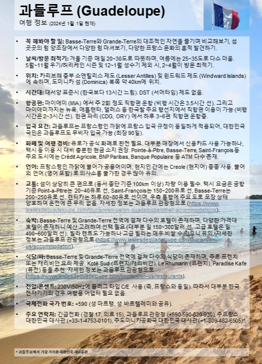 주요 연락처: 긴급전화 (경찰 17, 의료 15), 과들루프 관광청 (+590-590-820-930), 주프랑스 대한민국 대사관 (+33-1-4753-0101), 주도미니카공화국 대한민국 대사관 (+1-809-482-6505)*.