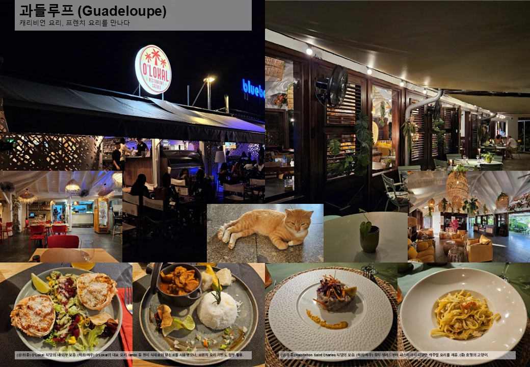 식당/바: Basse-Terre 및 Grande-Terre 전역에 걸쳐 다수의 식당이 존재하며, 주로 프렌치 또는 캐리비안 요리 제공. Koté Sud (프렌치/캐리비안), Le Rhumarin (프렌치), Paradise Kafe (퓨전) 등을 추천. 자세한 정보는 과들루프 관광청으로 (https://www.lesilesdeguadeloupe.com/tourism/en-us/restaurants).