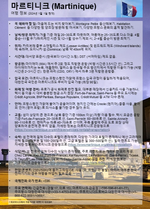 교통: 섬이 상당히 큰 편으로 (남북 종단 기준 100km 이상) 차량 이용 필수. 택시 요금은 공항 기준 Fort-de-France는 20~30유로 선, Saint-Pierre는 60~80유로 선, Sainte-Anne는 90~110유로 선. 렌터카는 하루 40~70유로 선이며, 우측 통행에 주요 도로 포장 상태 양호하여 운전에 큰 무리 없음. 자세한 정보는 마르티니크 관광청으로 (https://www.martinique.org/en/travel/services-rentals/transportation).