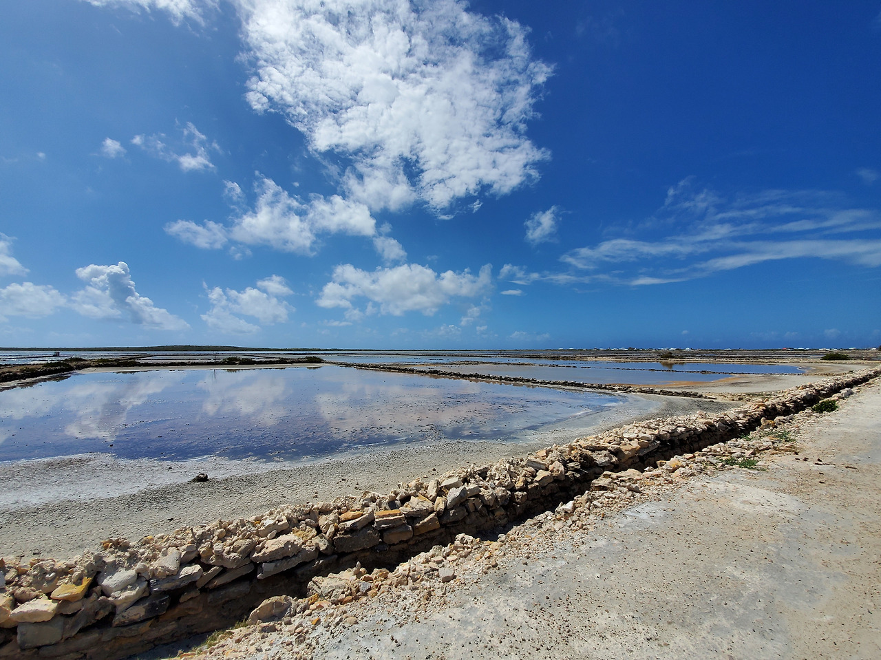 솔트 케이의 염전. 한없이 맑은 하늘과 그 위에 떠있는 구름이 잔물결 하나 없는 염전에 그대로 비친다.