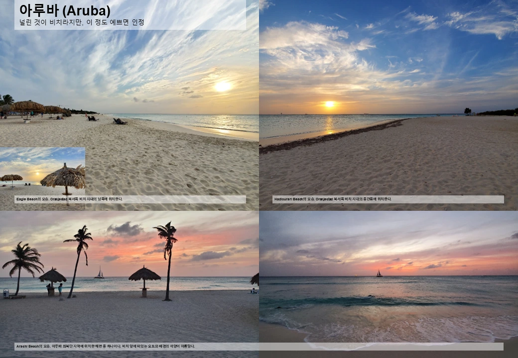 인정할 수밖에 없다. 카리브해에 널린 것이 섬이고 섬에 널린 것이 비치라지만, 아루바의 비치는 그 중에서도 가장 훌륭한 축에 든다. 수 킬로미터에 달하는 해변에 새하얀 모래가 끝없이 펼쳐져 있는데, 그 너비가 무려 70~80m에 달한다. 그리고 그 앞에는 다시 끝없는 바다, 그리고 푸르른 하늘까지.
