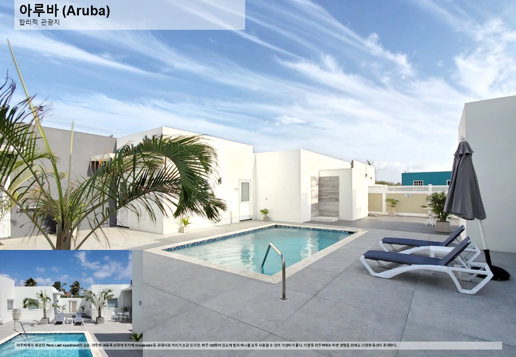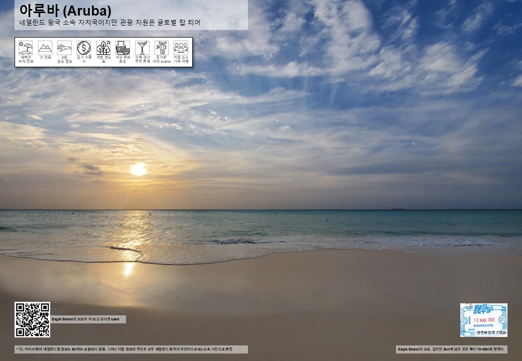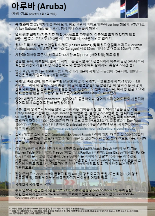 입국 요건: 아루바는 네덜란드령 자치국이기 때문에 자체 입국 규정이 적용되며, 대한민국 국민은 무비자 입국 가능 (최장 30일)**.