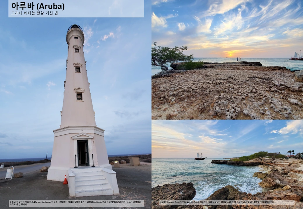 그래서 아루바 최북단과 최남단에는 모두 등대가 존재한다. 자칫 잘못하면 근처를 지나던 배가 거친 바다에 침몰할 수 있으니까. 실제로 최북단 California Lighthouse는 1891년 근처 바다에서 침몰한 증기선 California호의 이를을 따 그리 명명되었다. 오늘날 한없이 평화로운 등대의 모습 뒤에는 이런 슬픈 과거가 서려 있다.