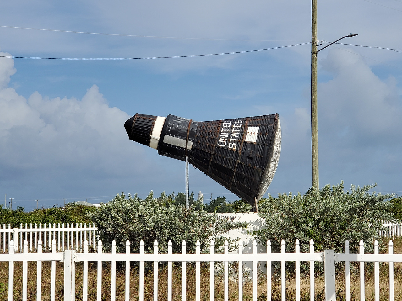 그랜드 터크 공항 앞에 전시되어 있는 프렌드십 7호 (Friendship 7) 캡슐. 이곳 근처 바다에 착륙했던 것이 연이 되어 여기에 전시되게 되었다.