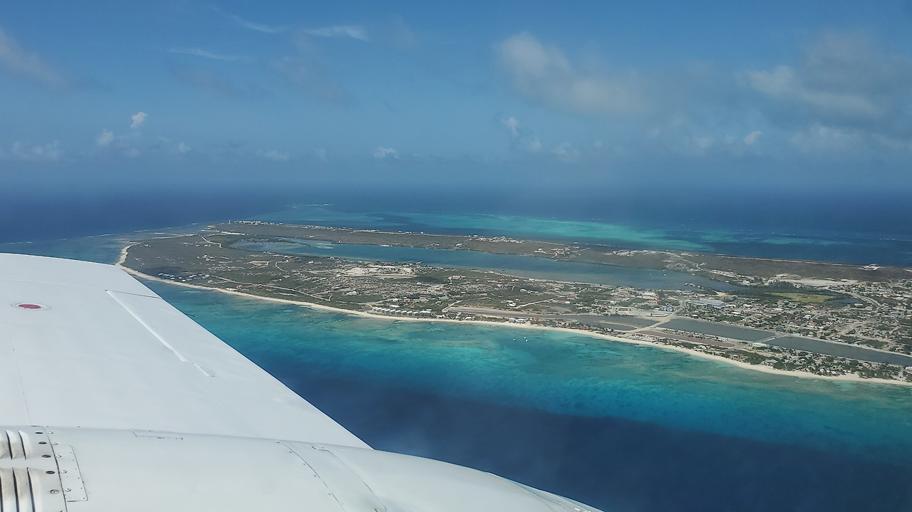 프로비던셜스 (Providenciales) 에서 날아온 비행기가 착륙을 준비한다. 산 하나 없는 평탄한 섬이 비행기를 환영하는 가운데, 벌써 하늘에서 본 풍경부터가 여유가 넘친다.