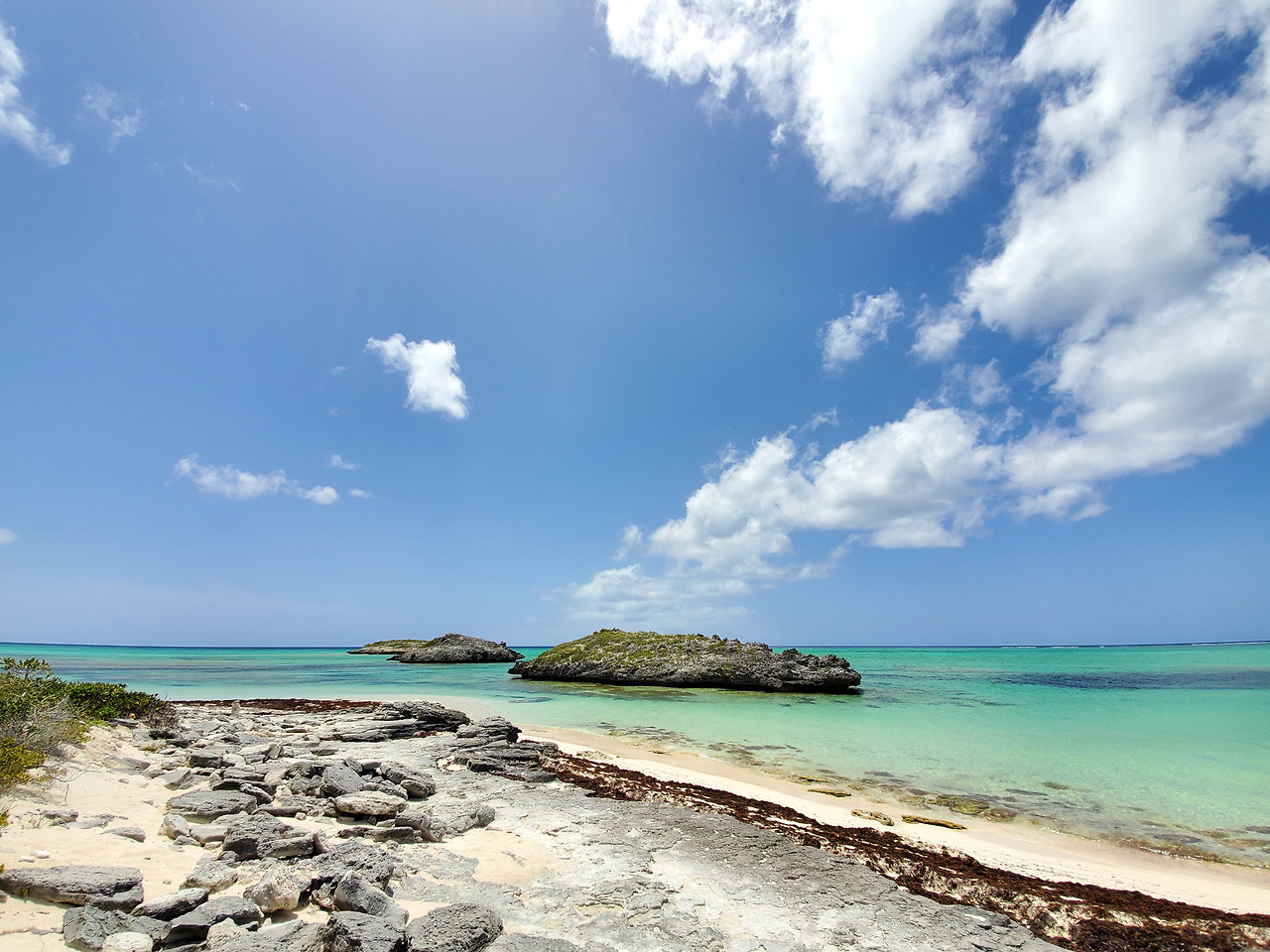 Three Mary Cays의 모습. 바다 위로 모습을 드러낸 바위 셋이 그 이름의 기원일 터.