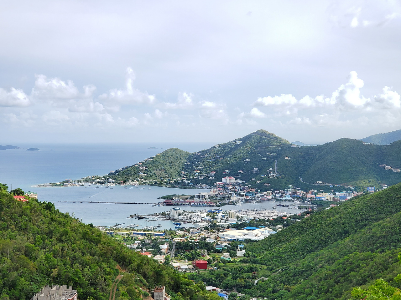 산 능선 도로에서 내려다본 수도 로드 타운 (Road Town) 의 모습. 산이 병풍처럼 둘러싸고 있는 안전한 항구를 중심으로 마을이 형성되어 있다.