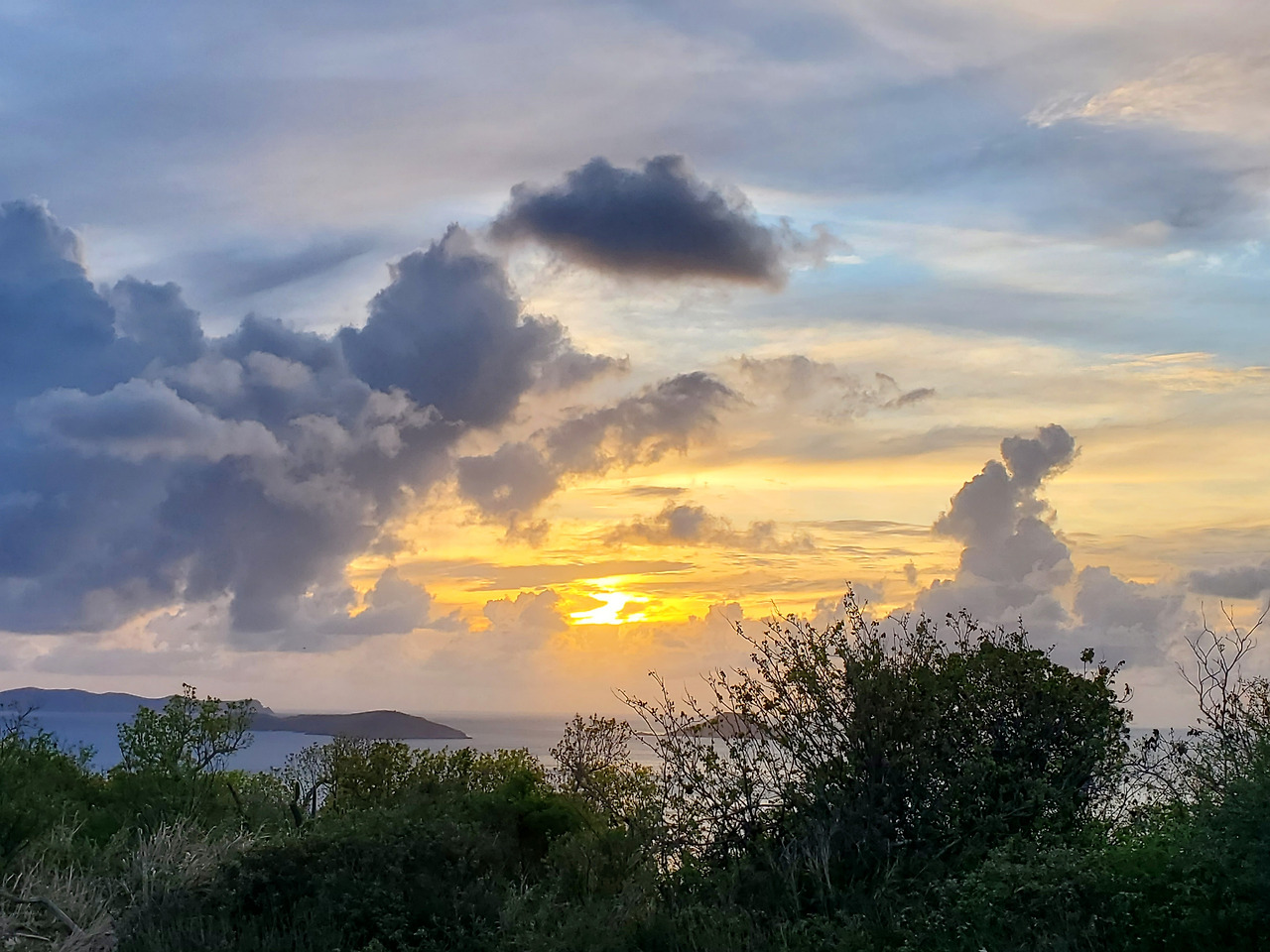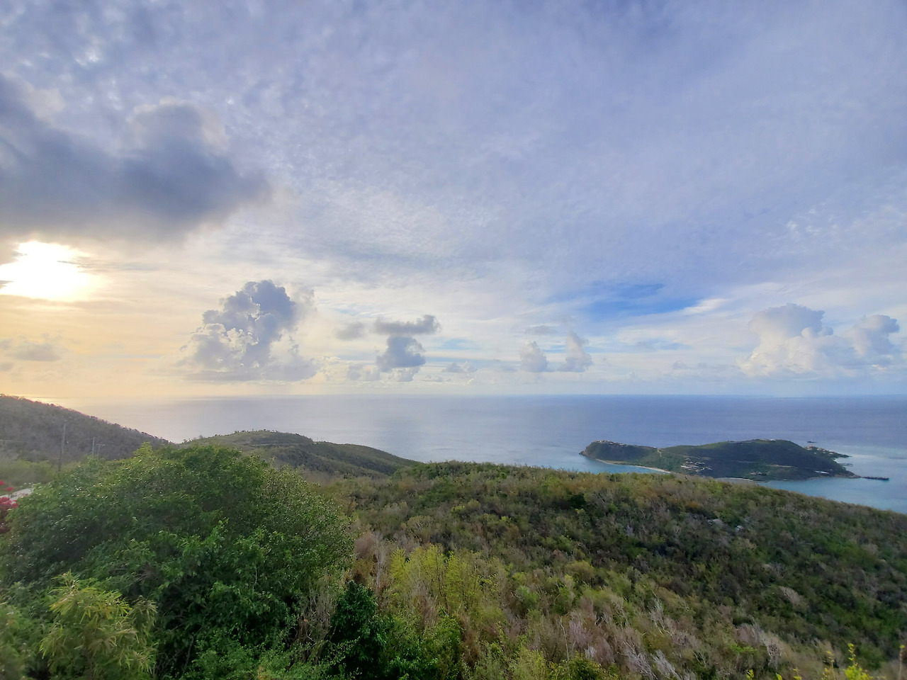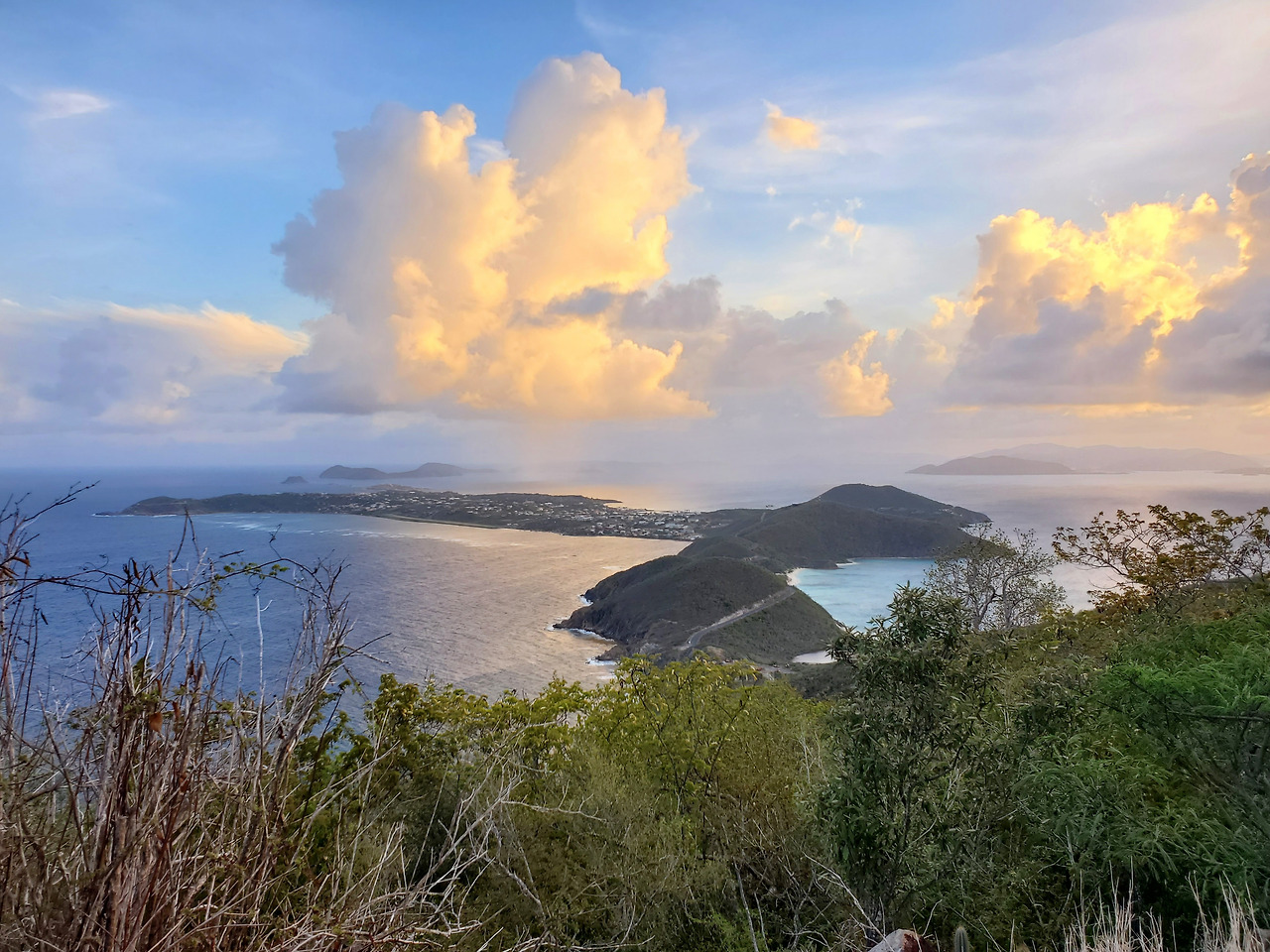 저 멀리 아스라히 보이는 Spanish Town (버진 고다 섬의 중심지) 과 그 위에 내려 앉은 구름. 햇볕이 더해져 황금빛으로 빛나는 구름이 포근하다.