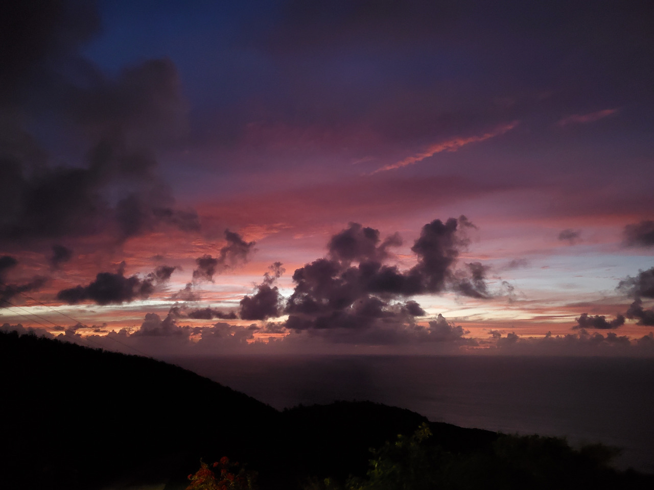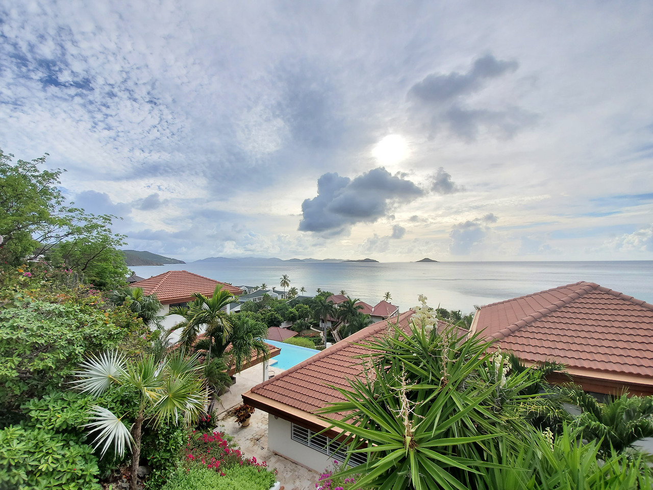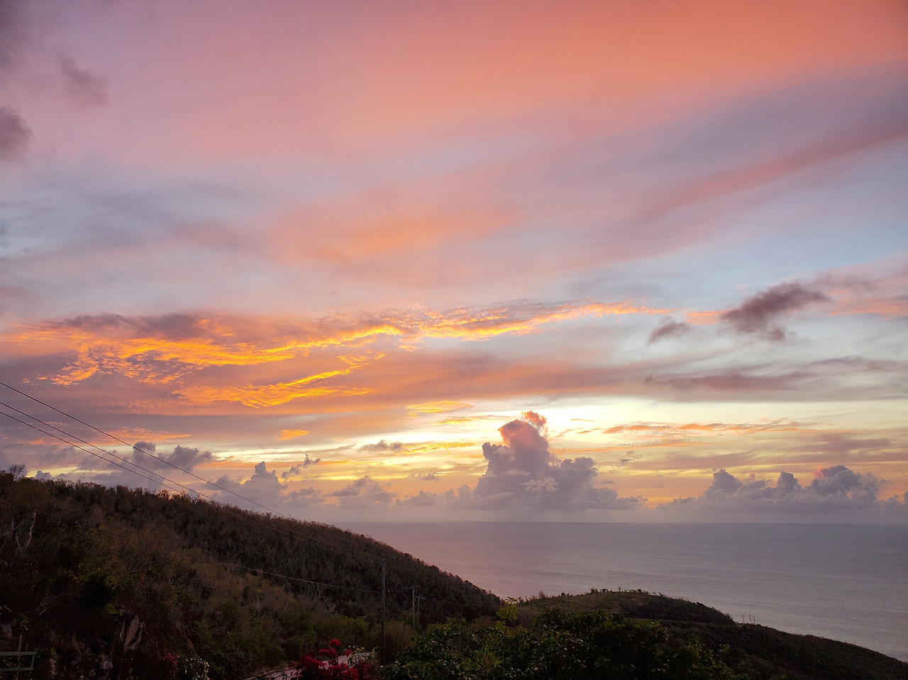 저 멀리 아스라히 보이는 Spanish Town (버진 고다 섬의 중심지) 과 그 위에 내려 앉은 구름. 햇볕이 더해져 황금빛으로 빛나는 구름이 포근하다.