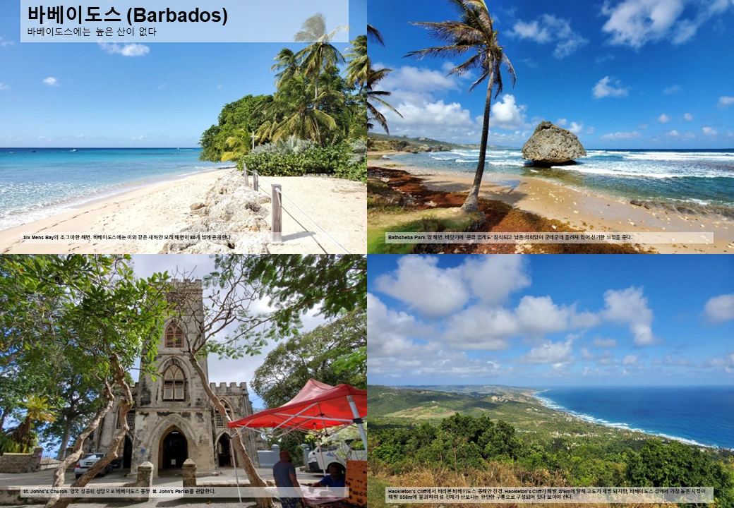 그래서 바베이도스의 가장 높은 지점도 해발 336m에 불과하며, 대부분 지역은 평지 또는 완만한 구릉을 이룬다. 카리브해에서는 오랜만에 느껴 보는 평지의 느낌이 제법 시원하다.