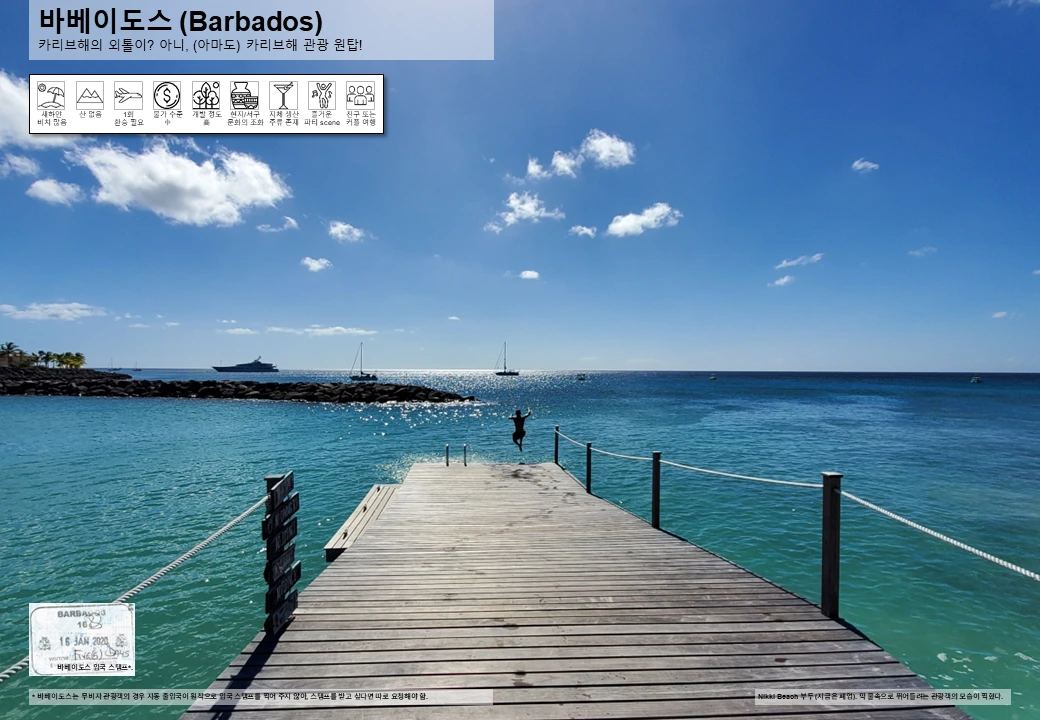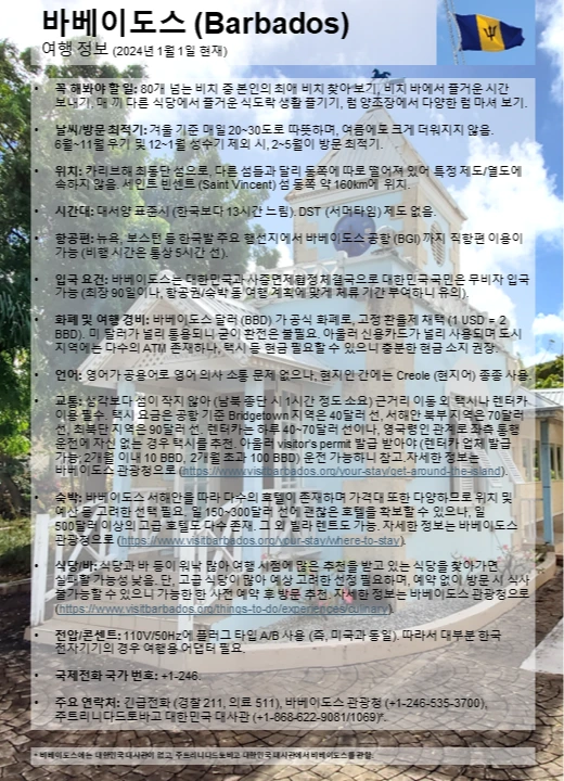입국 요건: 바베이도스는 대한민국과 사증면제협정 체결국으로 대한민국 국민은 무비자 입국 가능 (최장 90일이나, 항공권/숙박 등 여행 계획에 맞게 체류 기간 부여하니 유의).